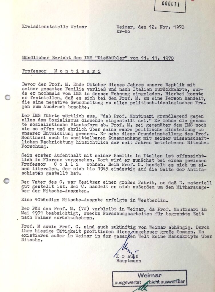 De Stasi blijft Montinari persoonlijk volgen maar niet hem alleen; ook de gangen van Herman Holtzhauer en Karl-Heinz Hahn, de directeur van het GSA worden nauwlettend nagetrokken en gerapporteerd. Over Montinari geen onvertogen woord, hij houdt zich aan de regels en is eigenlijk alleen maar bezig met zijn gezin en werk dat vooralsnog niet echt in de openbaarheid is. Het blijven immers teksten van een staatsvijand, de ‘theoretische grondlegger voor de nazi’s’. Als er al iets opvallends aan de man was moet dat zijn bijzondere auto, de kleine Fiat, zijn geweest. Niet de rode 500 zoals deze recentelijk in de media stilistisch is gefotoshopt maar een witte en dan model 600, waarmee hij tussen ‘Villa Silberblick’ en het GSA reed. Of het was zijn opvallende gezinsuitbreiding midden jaren ‘60; na hun eerste zoon kwam de reeds vermelde drieling: de tweede zoon en twee dochters krijgen al gauw de bijnaam ‘Die Weimarer Drillinge’.
