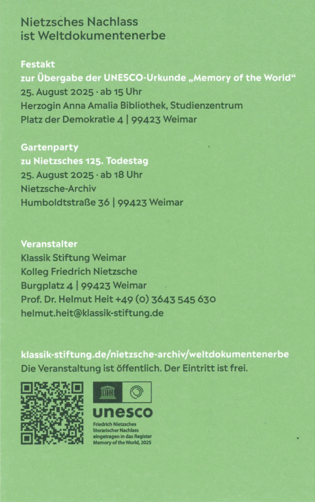 Op maandag 25 augustus 1900 blies Nietzsche zijn laatste levensadem uit. Maandag de 25e is dat 125 jaar geleden, reden voor extra activiteiten in Weimar. De dames en heren van de Klassik Stiftung Weimar en Unesco Welterbe hebben niet stilgezeten. Met meerdere officiële momenten zal maandag worden stilgestaan bij deze bijzondere positie van Nietzsches werk, zeker wanneer je in ogenschouw neemt dat alles met het grootste gemak er niet meer was geweest indien de geschiedenis een andere loop had genomen. Zie hiervoor ook mijn blogbijdrage met de titel ‘Nietzsche in Italiaanse handen’ van 14 mei 2022. (https://friedrichnietzsche.nl/nietzsche-blog/nietzsche-in-italiaanse-handen/)